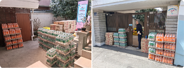 전달된 물품은 간편하게 식사를 해결할 수 있는 즉석밥과, 아이들이 좋아하는 음료수입니다.