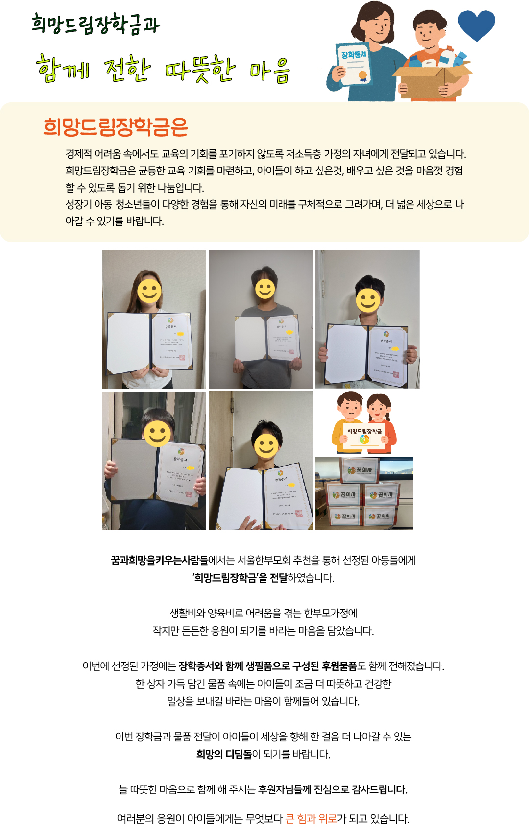 아이들의 내일에 희망을 더하다. 희망드림장학금과 후원물품 전달 등록일2025.10.22 조회수6 댓글 0댓글쓰기 댓글목록 등록된 댓글이 없습니다. 이전글 무대 위에서 만난 꿈과 감동의 시간. 뮤지컬 관람 나눔 이야기 다음글 함께 달리고 웃으며, 서로를 응원한 하루 목록